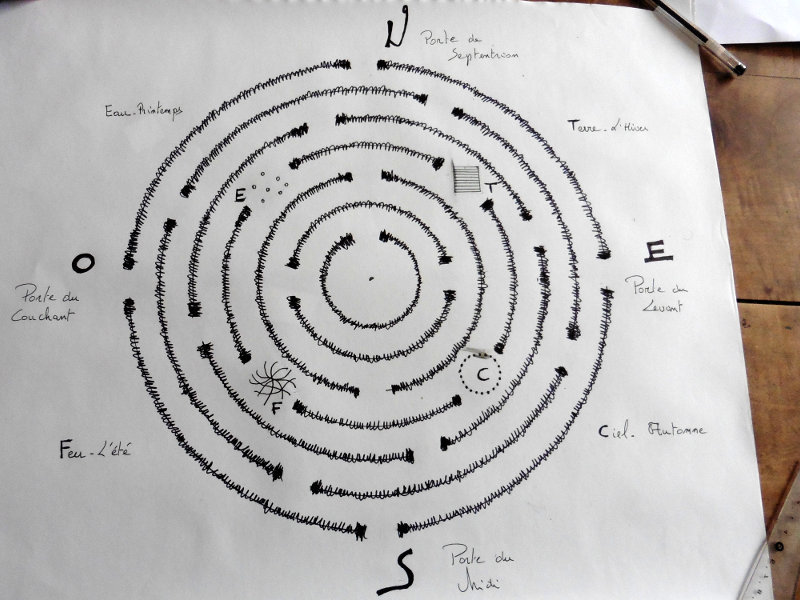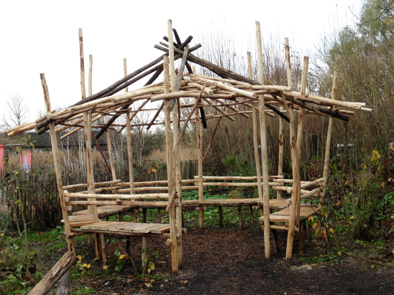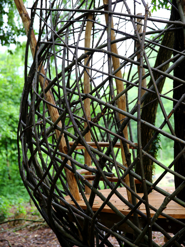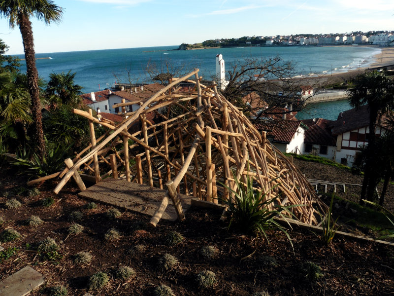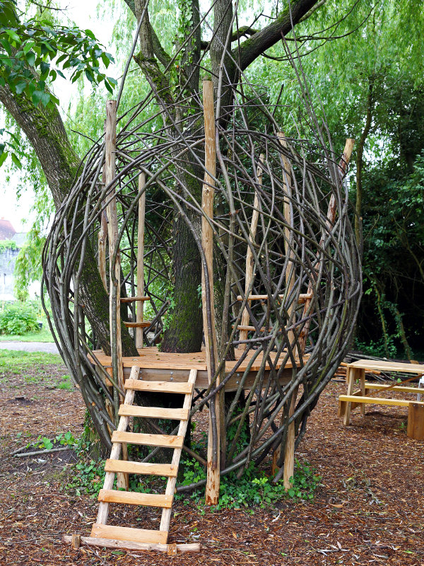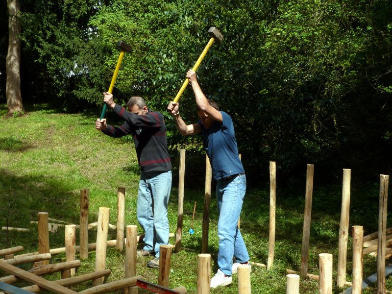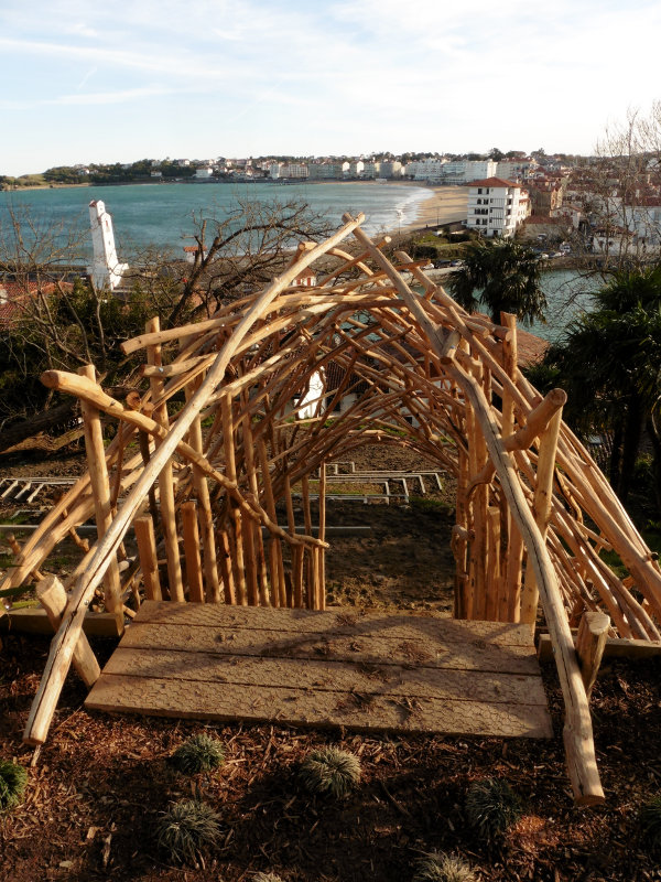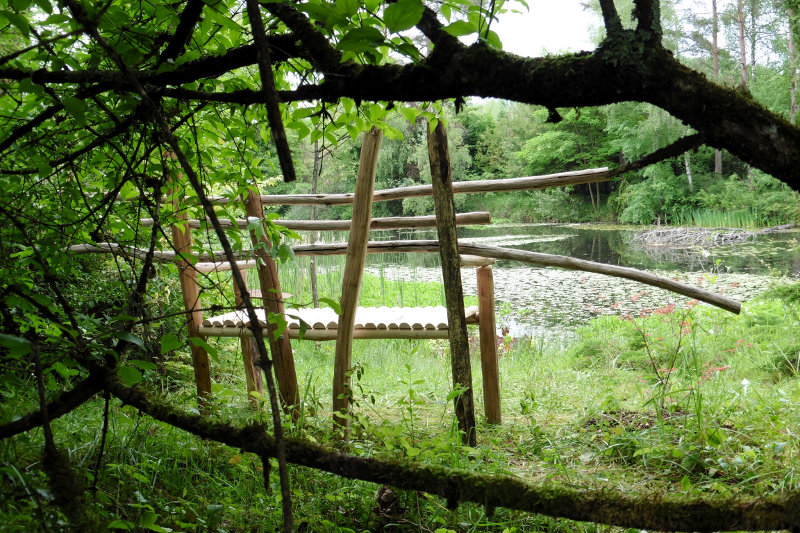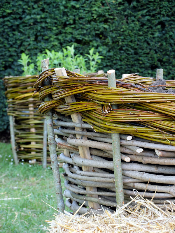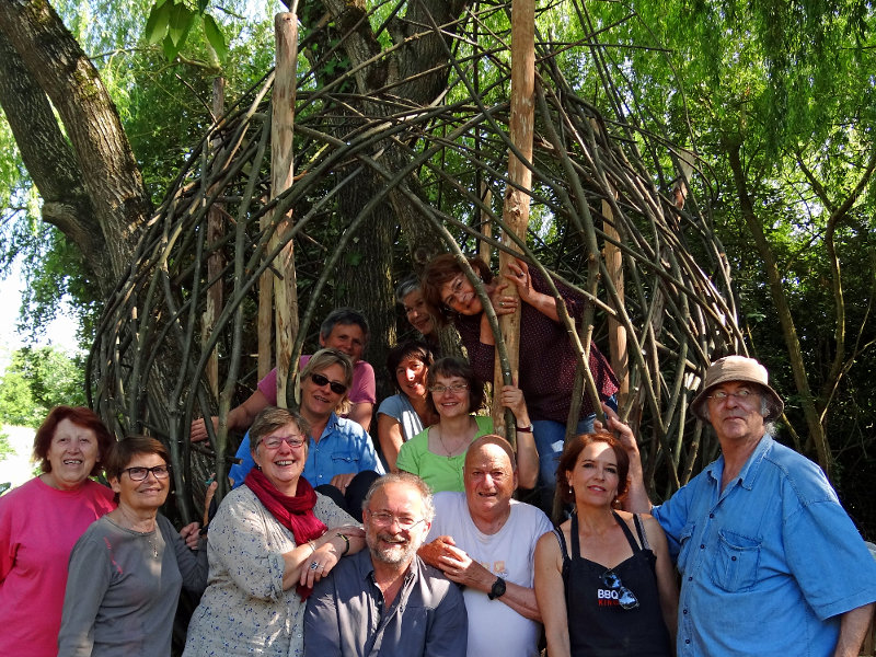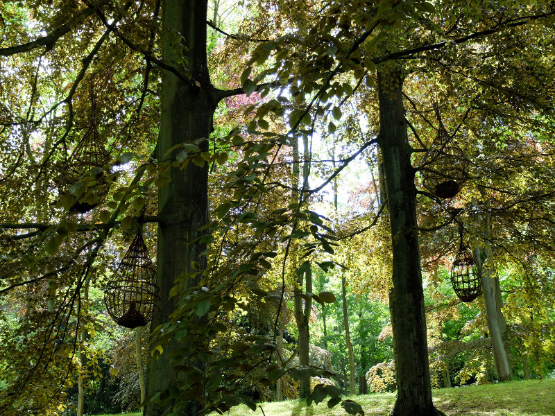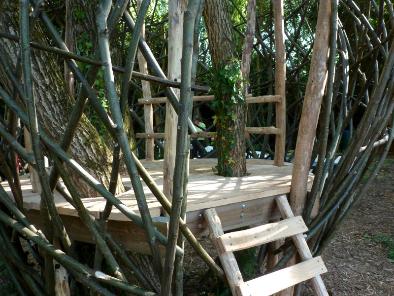 Tunnel tressé, tontines pour recevoir une collection de menthes, petites constructions en osier de protection d’enceintes sur un bassin, plateforme de découverte d’une perspective, bulles tressée suspendues à de grands hêtres symbolisant la sève et plateaux parfaitement à l’horizontale permettant au public d’apprécier la verticalité des grands troncs de hêtres ont été construits avec les personnes en formation, stagiaires et autres gourmands de gestes.