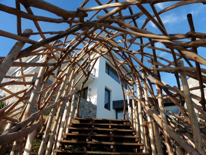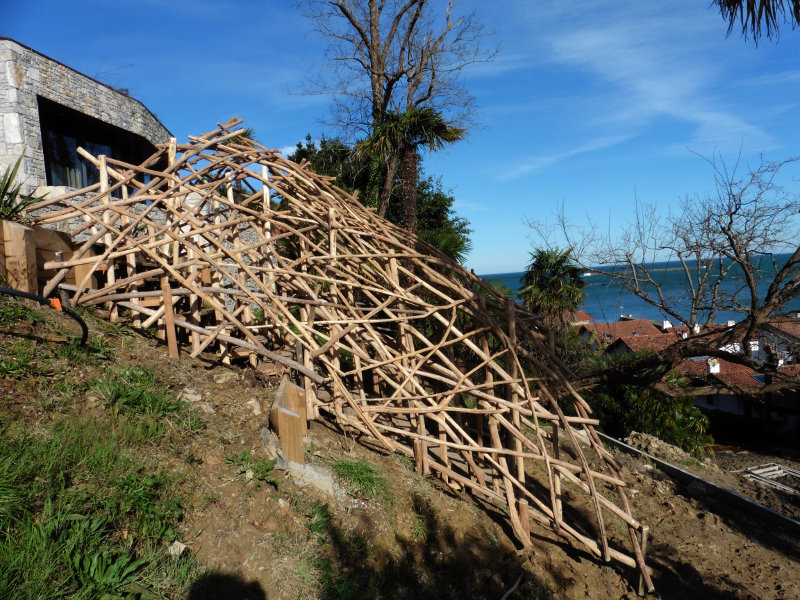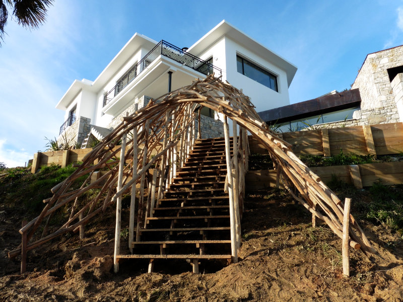 Conception et réalisation d'un escalier en acacia dans une forte pente, recouvert d'un tunnel constitué de plus de cent brins de châtaignier mort sur pied, dans un jardin dominant la plage.