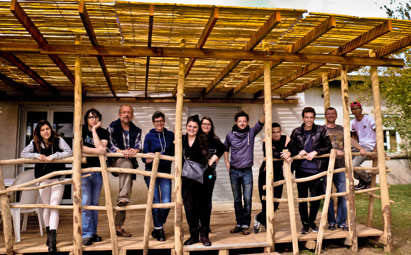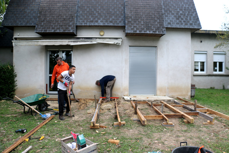 Le chantier s’est déroulé sur 7 jours en septembre 2015, avec Denis et Thomas, les éducateurs de rue de la ville, et Gaëlle, animatrice au centre social. Six jeunes personnes ont fait preuve d’une très belle présence, à tel point, que le dernier soir, ils ne voulaient pas quitter la terrasse construite! Faire une chose vous en rapproche... un peu leur terrasse, en somme...