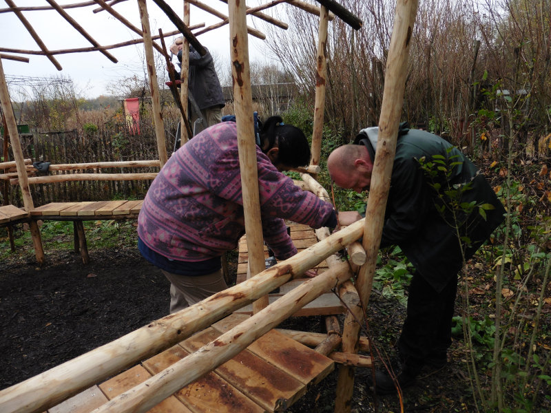 Animation/formation à la construction d’un kiosque avec la présence très participative et souriante de personnes de l'association Régie Plus